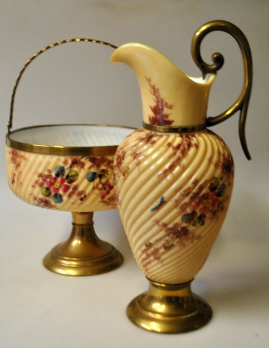 Deutsches Erdbeerset, bestehend aus Schale auf Fuß und Kanne, ca. um 1900. Fuß und Griff aus Messing - früher versilbert. Schale und Krug aus weißem Opalglas mit cremefarbener Übermalung und Emailmalerei von Blumen und Insekten. Schalehöhe: 17,5 cm. Durchmesser: 18,5 cm. Kanne, Höhe: 28 cm.