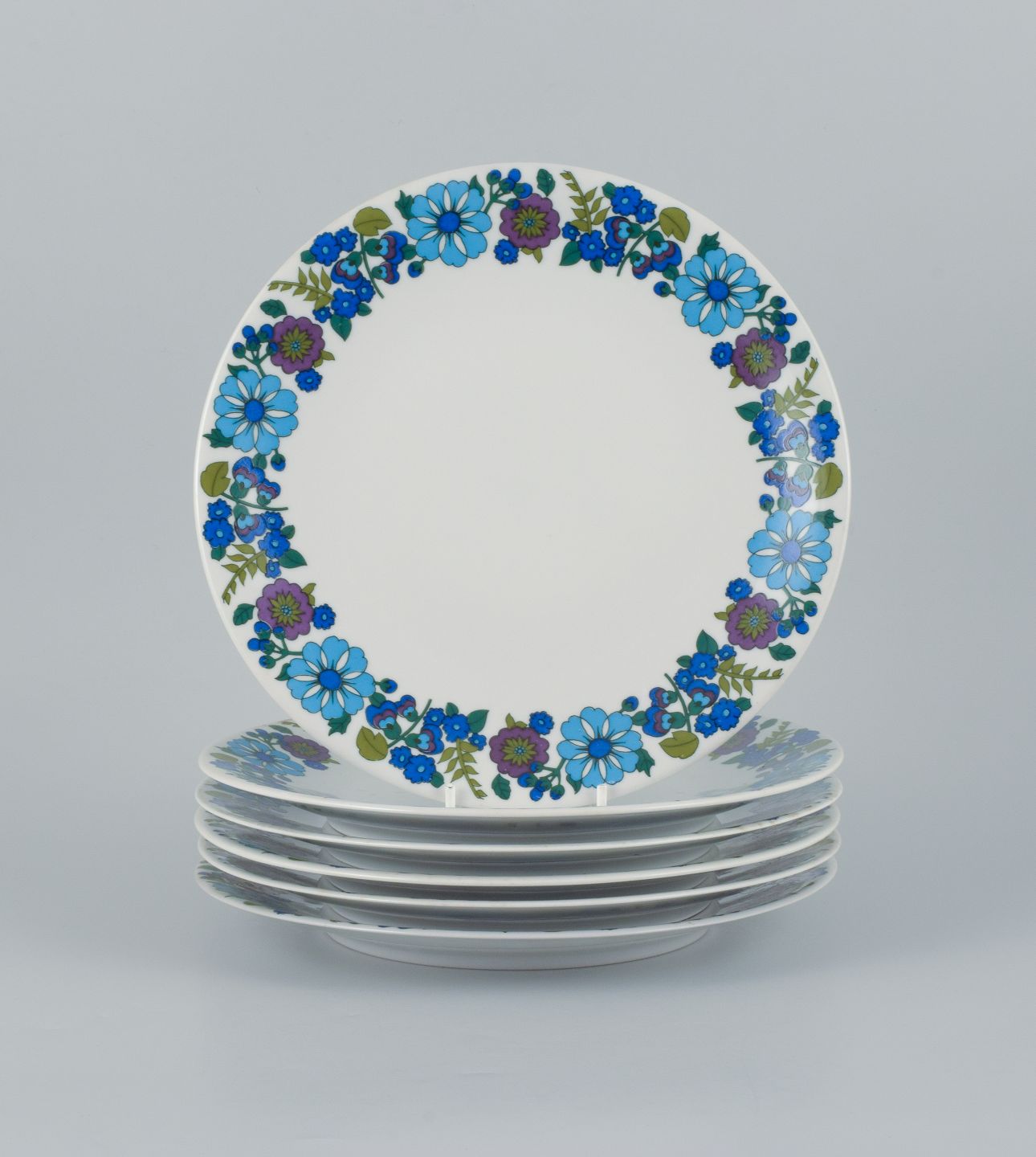 Et sæt på seks retro middagstallerkner i porcelæn med blomstermotiv.
