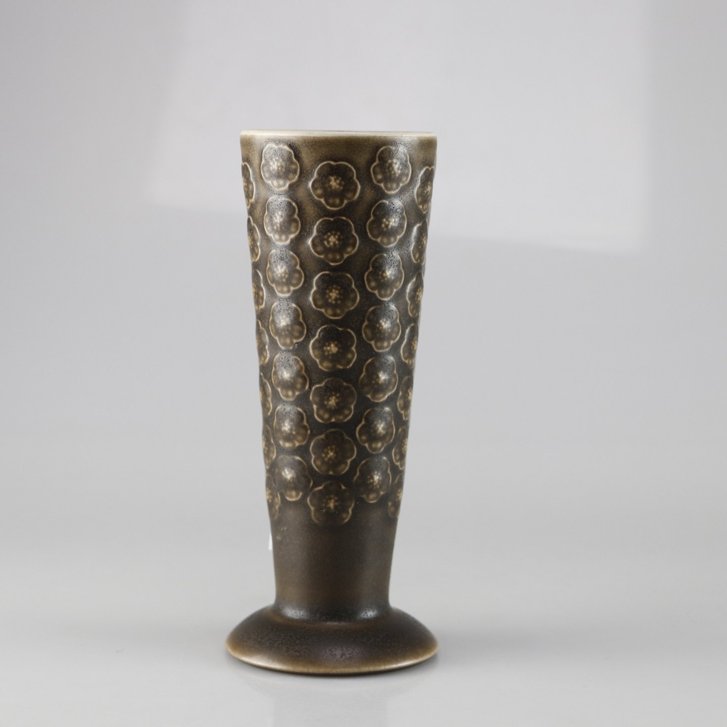 Stel i brun stentøj med blomster motiver. Den kan vendes så den enten er en vase eller en lysestage.