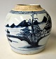 Blå/hvid kinesisk bojan, 19. årh. Uden låg. Dekoreret med landskab, bjerge, skib og fiskende. H.: 15 cm.