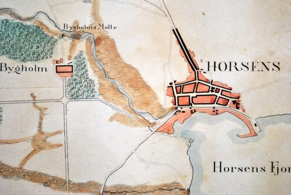 Skelet Kort over Horsens og omegn, 1823. Håndkoloreret litografi. 59 x 48 cm.