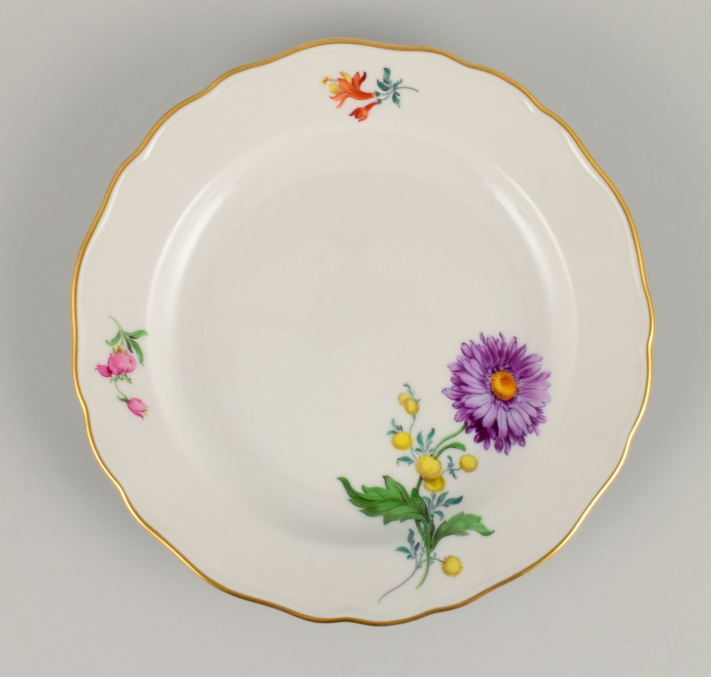 Meissen, Germany, three plates hand painted with flowers and gold decoration.