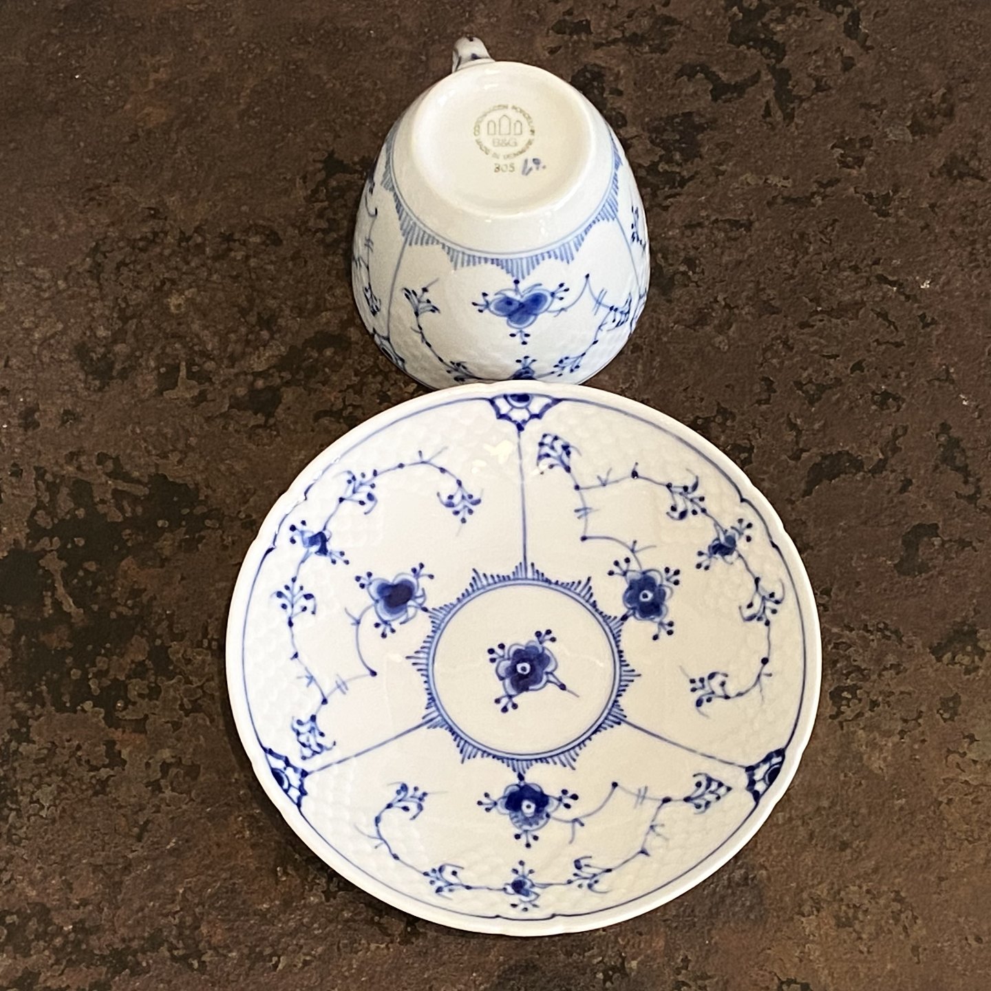 Blåmalet (musselmalet) kaffekop nr 305/102 med underkop.