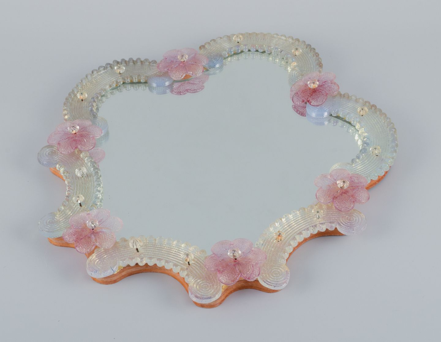 Murano, Venedig, spejl i kunstglas, guld og rosa dekoration.