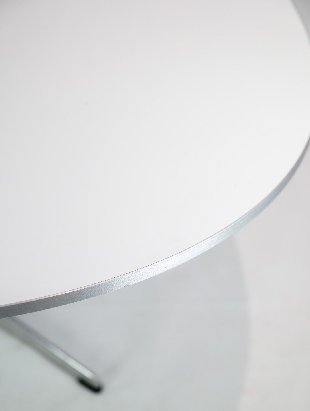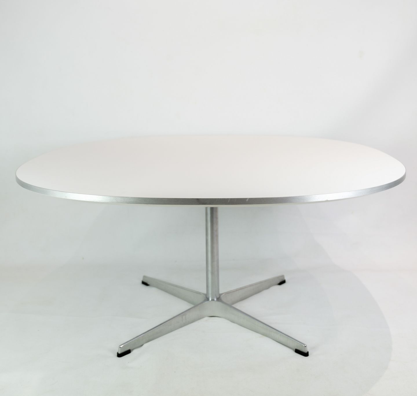 Sofabord, designet af Piet Hein/Bruno Mathsson/Arne Jacobsen og produceret af Fritz Hansen i 2018. Bordet har hvid laminat med aluminium sølvkant, samt aluminum stel. Stemplet med original mærke og produktionsnummer.
