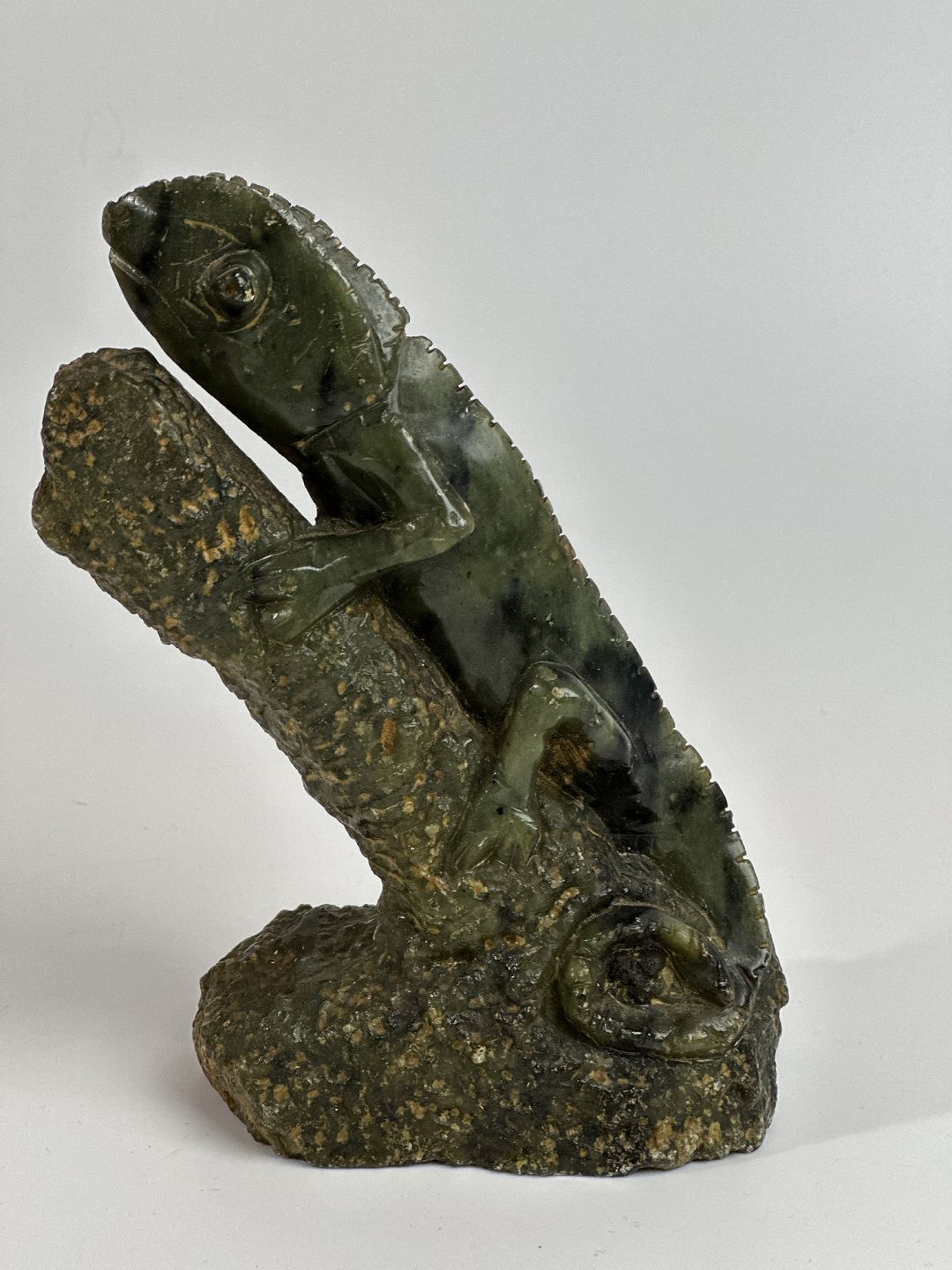 Kamæleon-figur, Afrikansk Shona skulptur, Zimbabwe. Signeret C. Tandi. Skåret i sten/mineral-materiale.