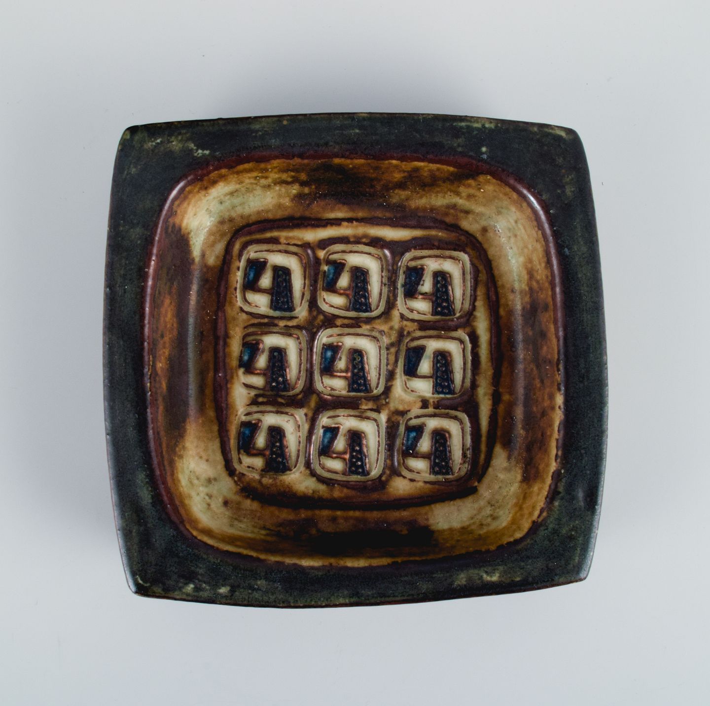 Jørgen Mogensen for Royal Copenhagen, to fade i stentøj med abstrakte motiver.