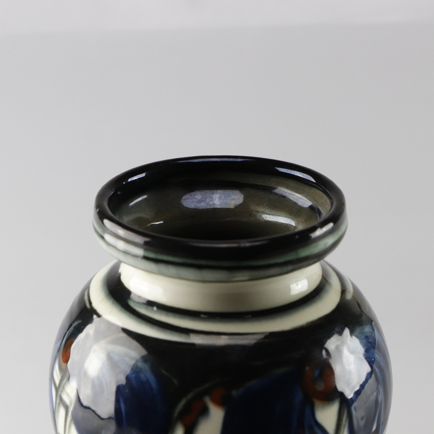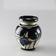 Vase med mørk glasering indeni og mønster med blå og brune blomster udenpå