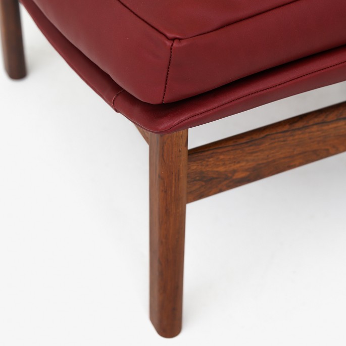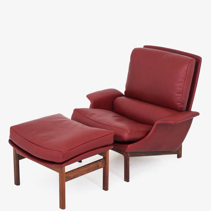 Nybetrukket lænestol og skammel i 'Elegance'-anilinlæder (farve: Indian Red) på stel af palisander. Formgivet i 1958.