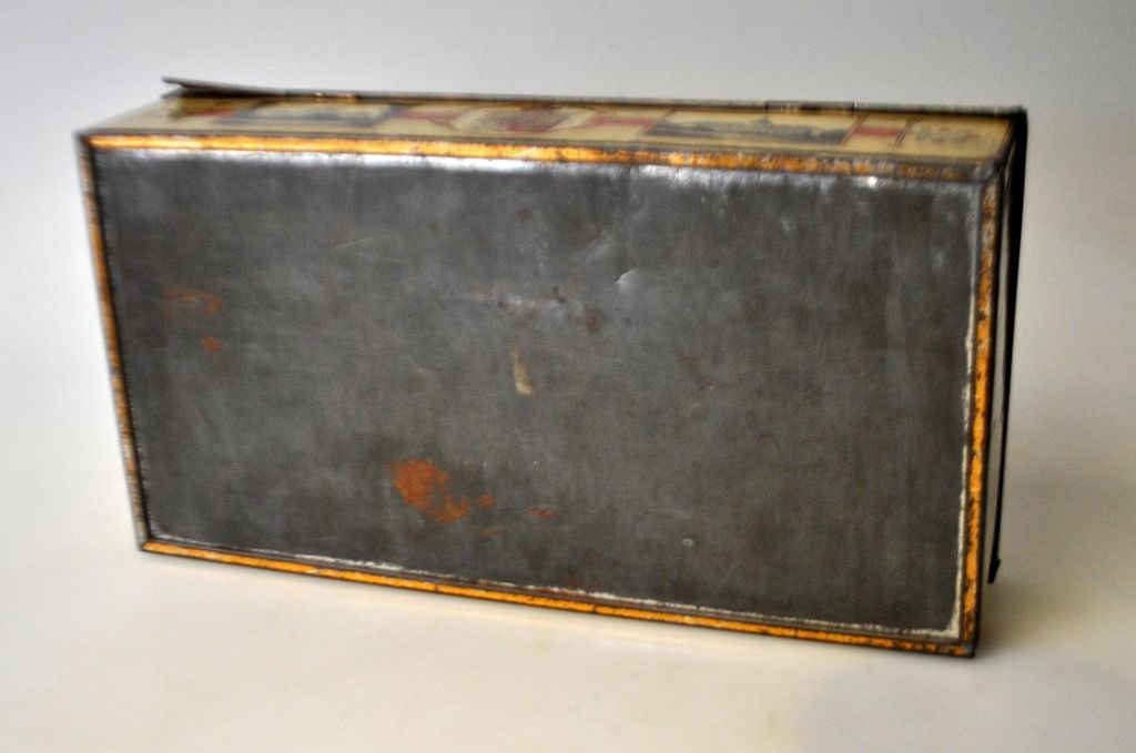 Tin box, tobacco tin, decorated with Denmark's royal couple - Frederik VIII and Queen Louise. Frederik VIII was king between 1906 - 1912. The sides are decorated with Danish buildings and castles. 21 x 11 x 4.8 cm.