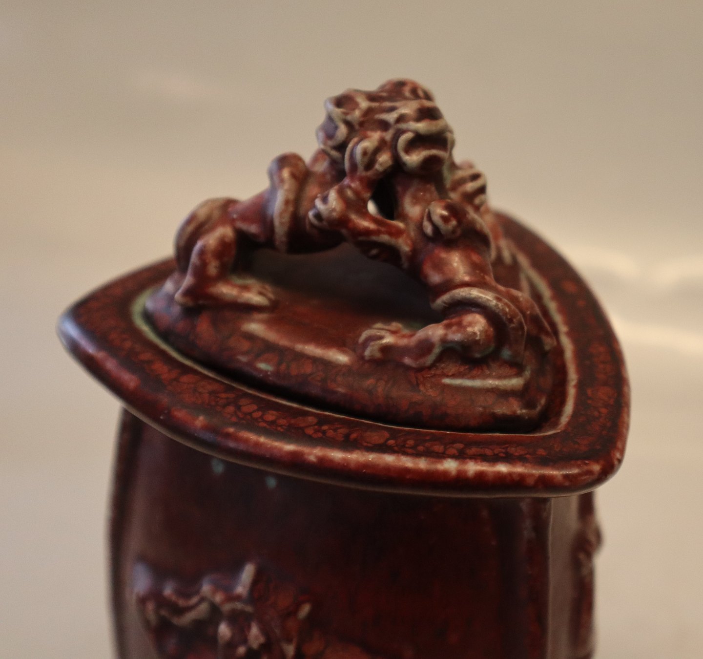 Okseblodsglasur 20160 Kgl. Trekantet vase med relieffer 20 cm, Bode Willumsen, marts 1928 Kongelig Dansk Stentøj