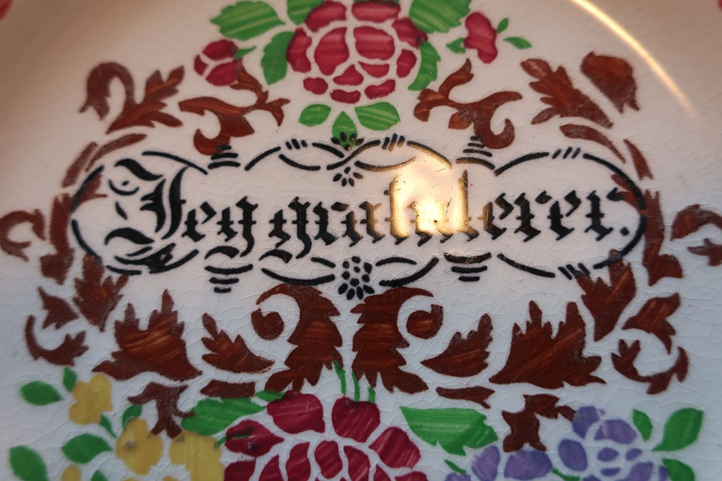 An old beautiful plate with the text "Jeg gratulerer" (I congratulate)