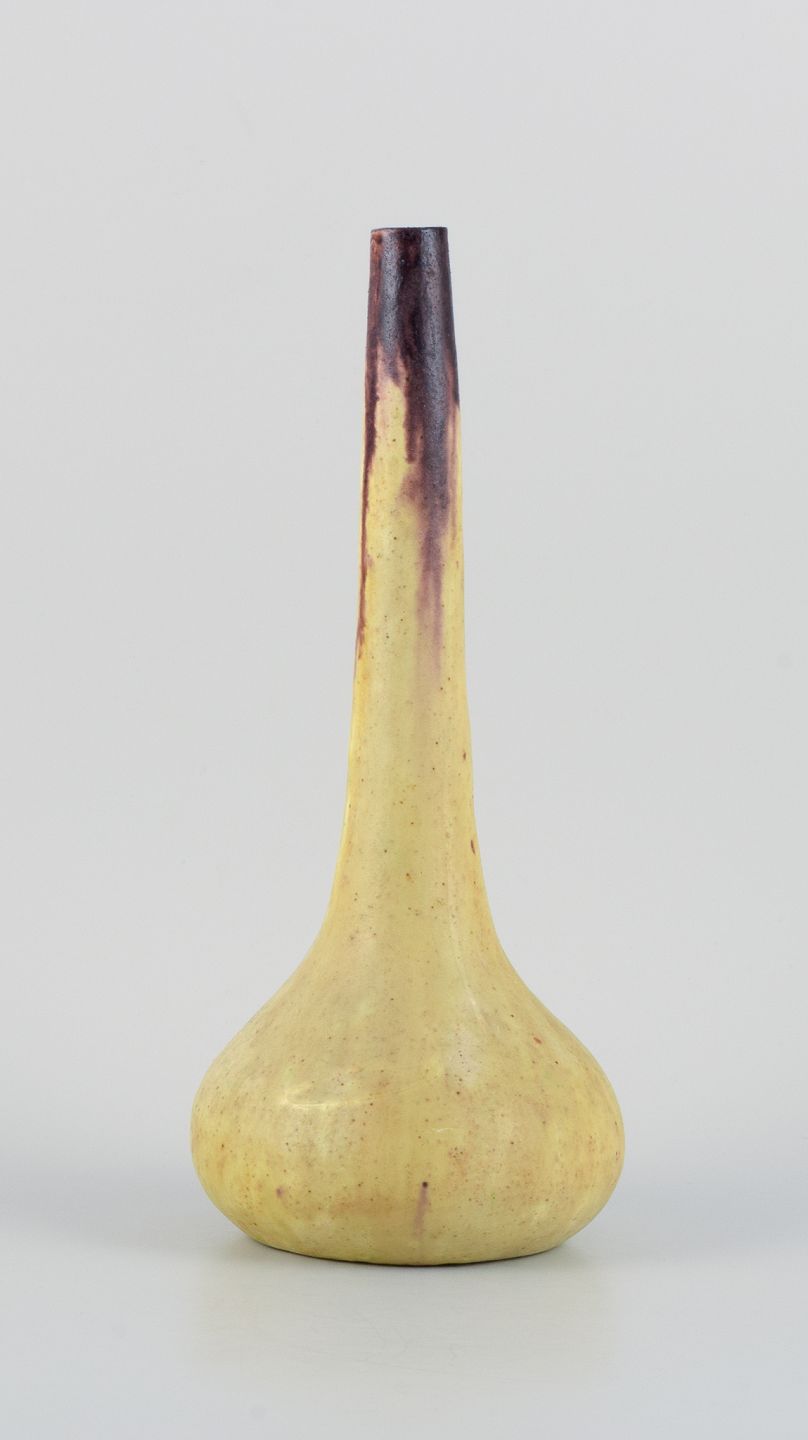 Europæisk studiokeramiker, høj smalhalset unika keramikvase i gul og brun dekoration. Antageligt belgisk keramiker.