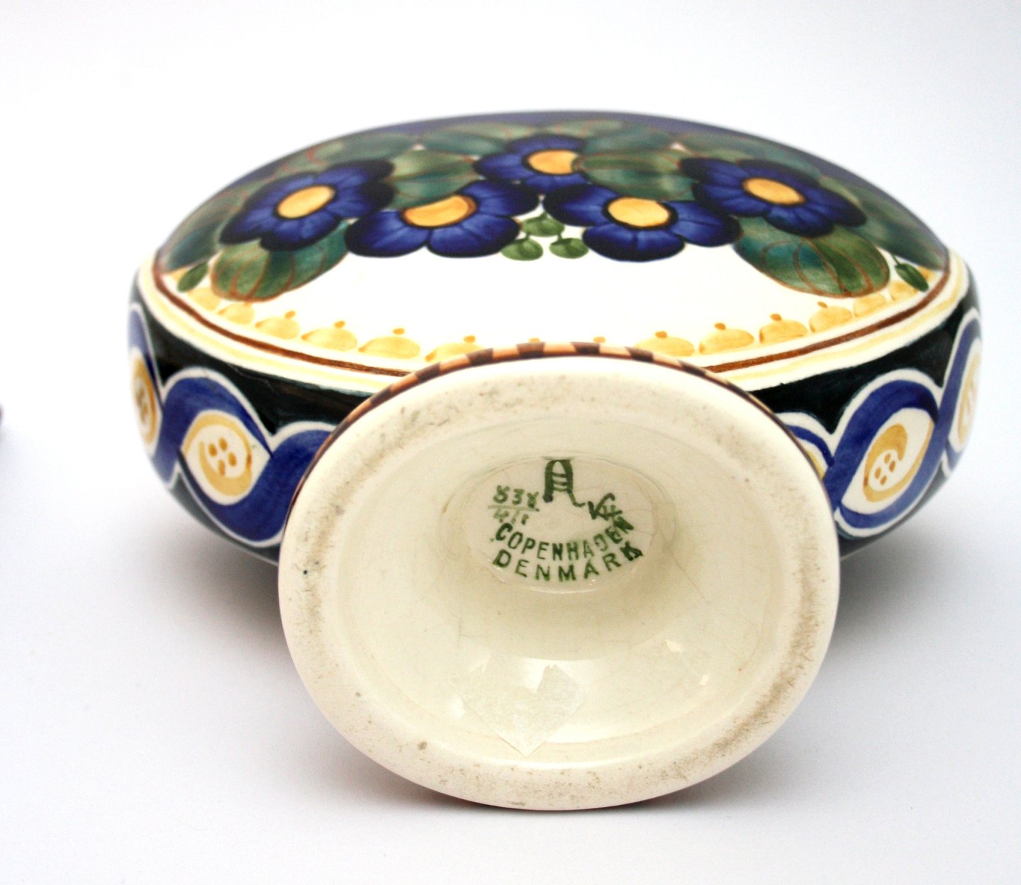 Aluminia, Jardiniere, 2 delt blomsteropsats fra skønvirkeperioden dekoration "Heibergs blå blomster." Designet af Harald Slott-Møller i 1912. Nr. 838/411. Højde 15,8 cm. Længde 19 cm. Bredde 9 cm. Flot stand med overfladekrakeleringer, ingen afslag. Pris for sæt: 3000 kr.