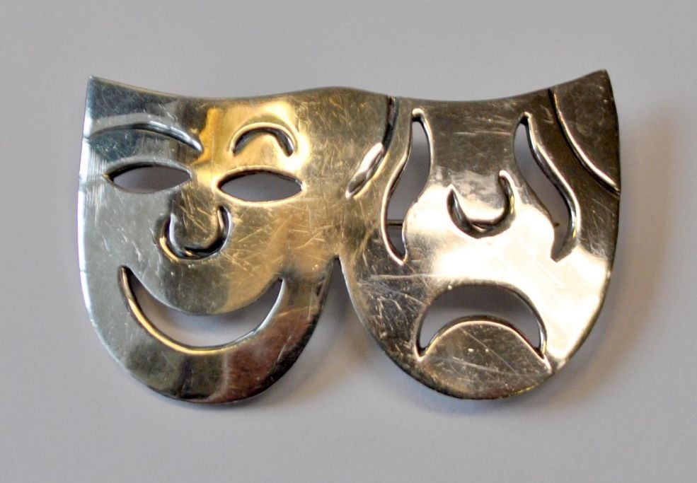 Sølv sterling brosche med teater masker, 20. årh. Mexico.
