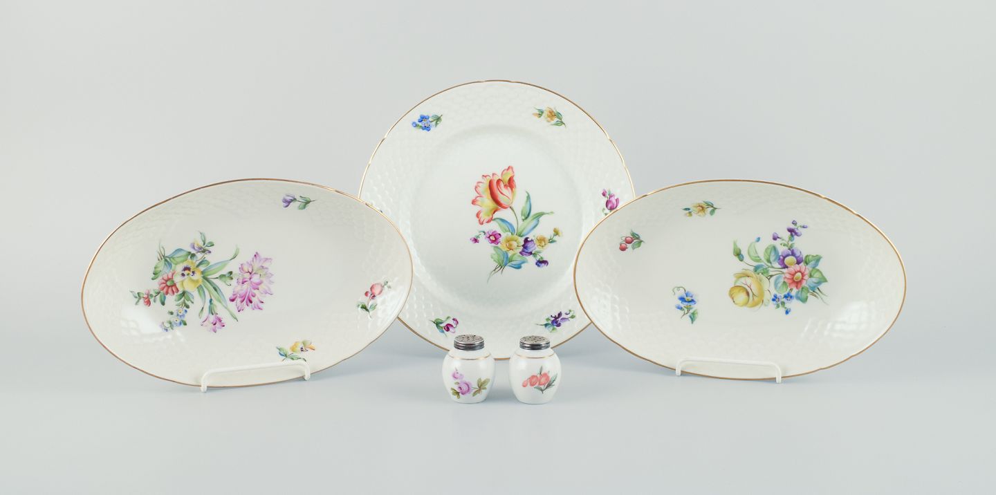 Bing & Grøndahl, Saksisk Blomst, en frokosttallerken, to ovale skåle og et salt og peber sæt. Hånddekoreret med polykrome blomster og guldkant.