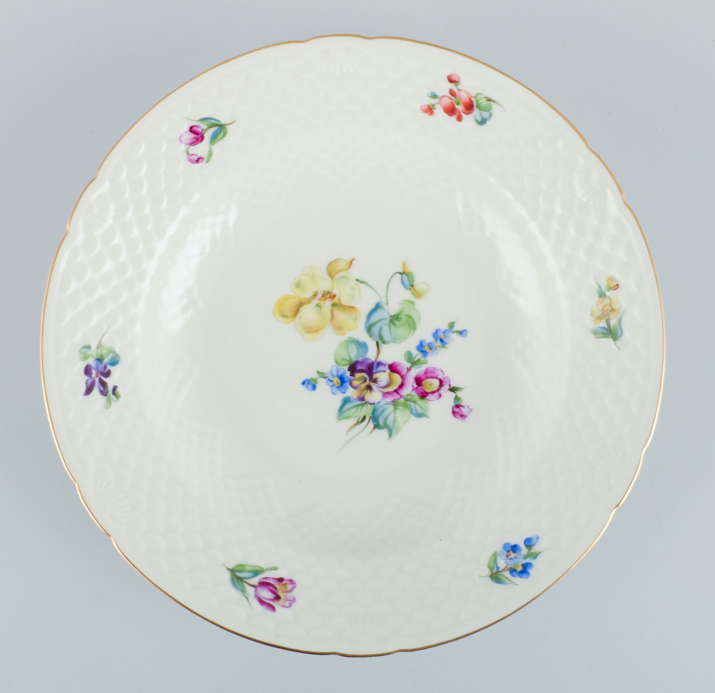 Bing & Grøndahl, Saksisk Blomst, et sæt på seks dybe tallerkner hånddekoreret med polykrome blomster og guldkant.