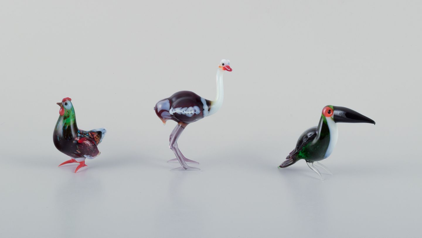 Murano, Italien. En samling på tre miniature glasfigurer af fugle i farvet kunstglas.