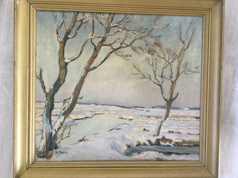 Maleri af Marius Skov - Nøgne træer ved å - vinter.