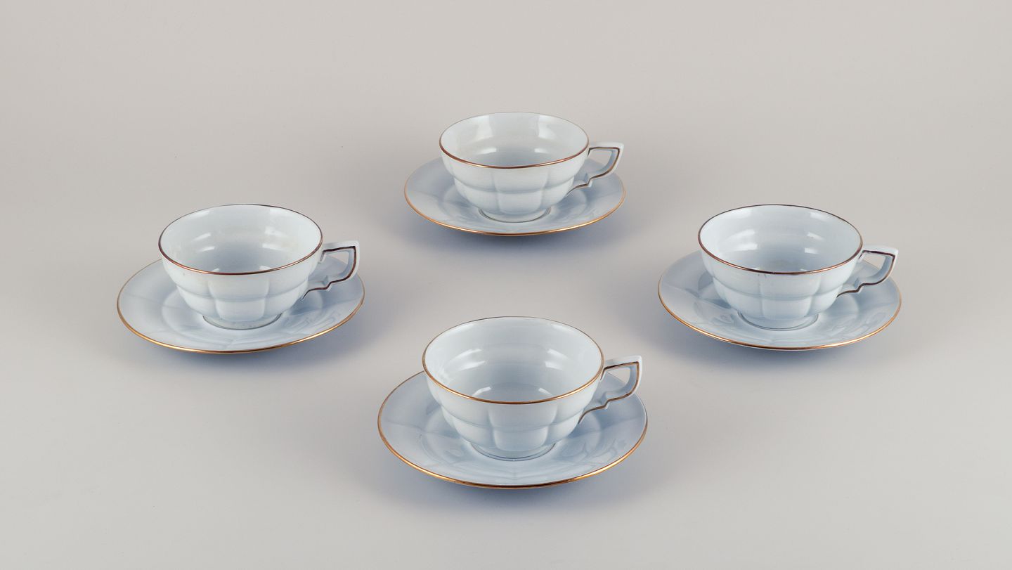 Gefle, Sverige, et sæt på fire ”Grand” Art Deco tekopper med tilhørende underkopper. Lyseblå fajance med guldkant.