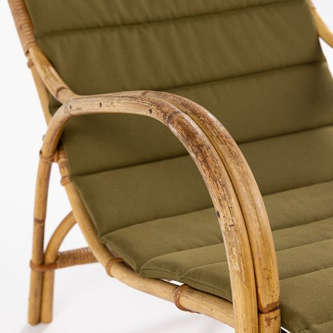 Kurvestol i flettet bambus med ny hynde i Toile Mistral (farve Militaire) fra Pierre Frey.