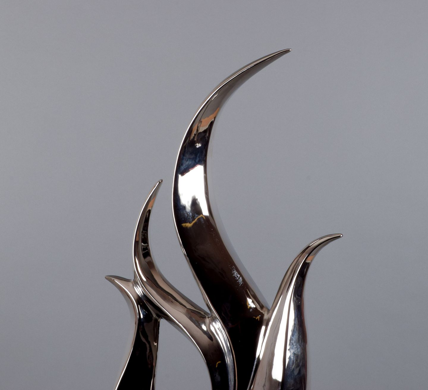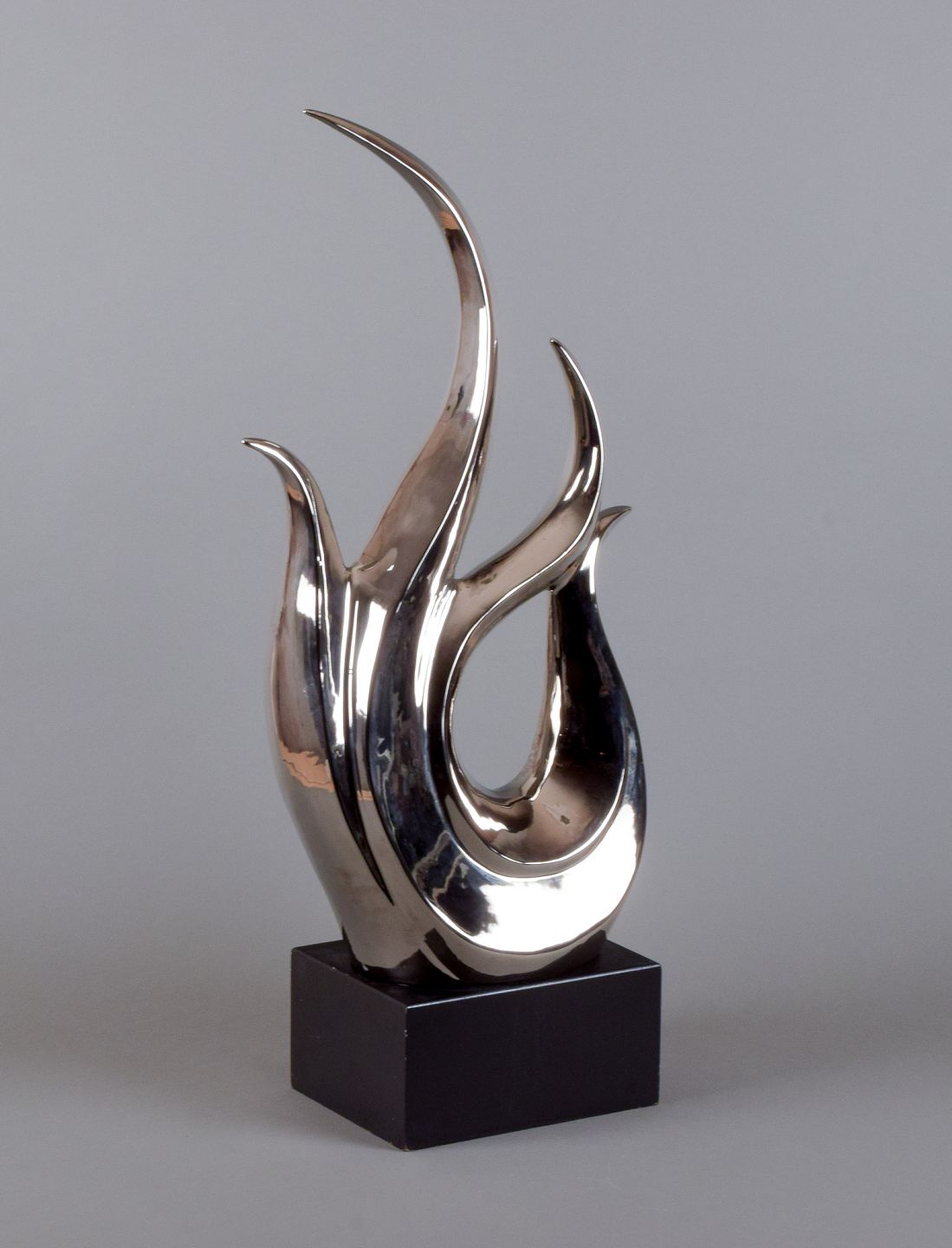 Monumental skulptur i dobbelt patineret metal, sokkel i træ.