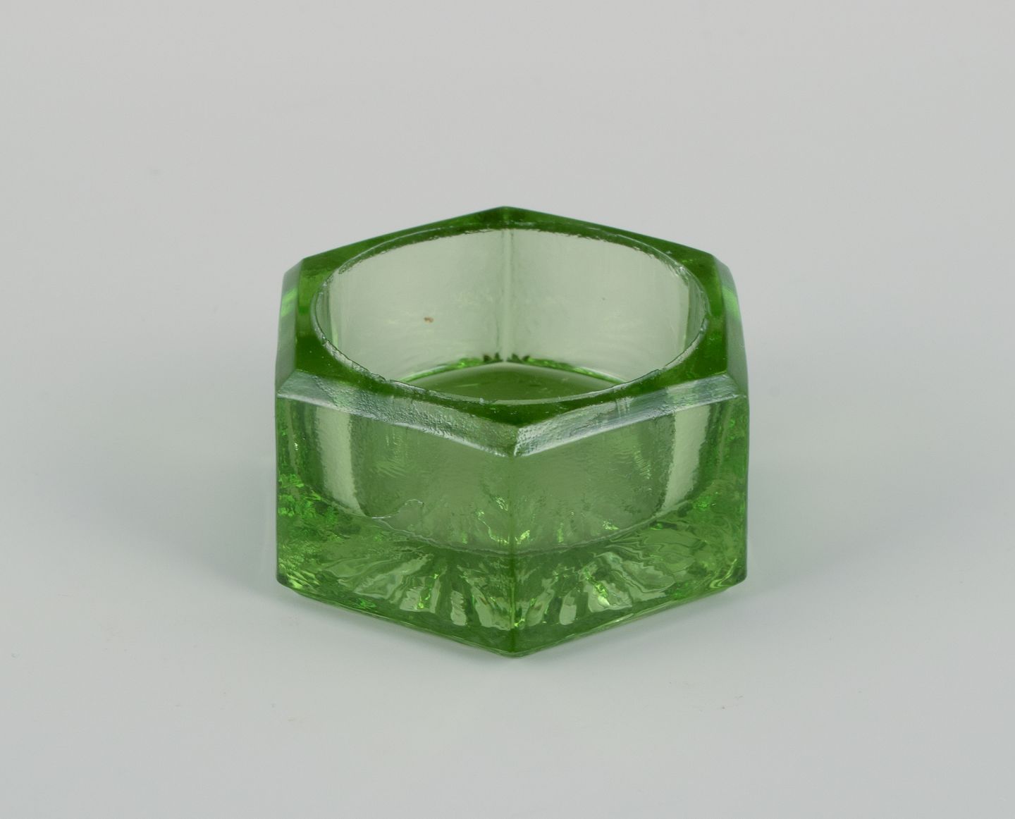 Seks saltkar i farvet glas. Grønt håndlavet glas.