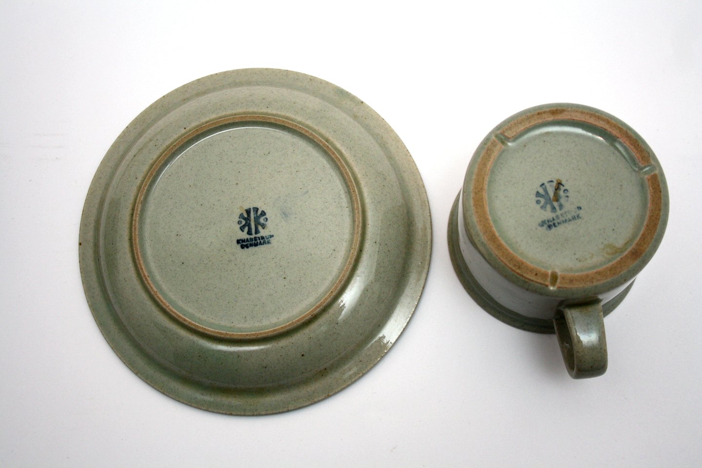 Knabstrup, Kattegat stentøjsstel grå glasur med blå kant og bærmotiv. Designet af Inger Persson 1975. Tekop. Diameter 8,5 cm. Højde 6,5 cm. Underkop diameter 16 cm. Pris: 100 kr. stk. Lager: 5