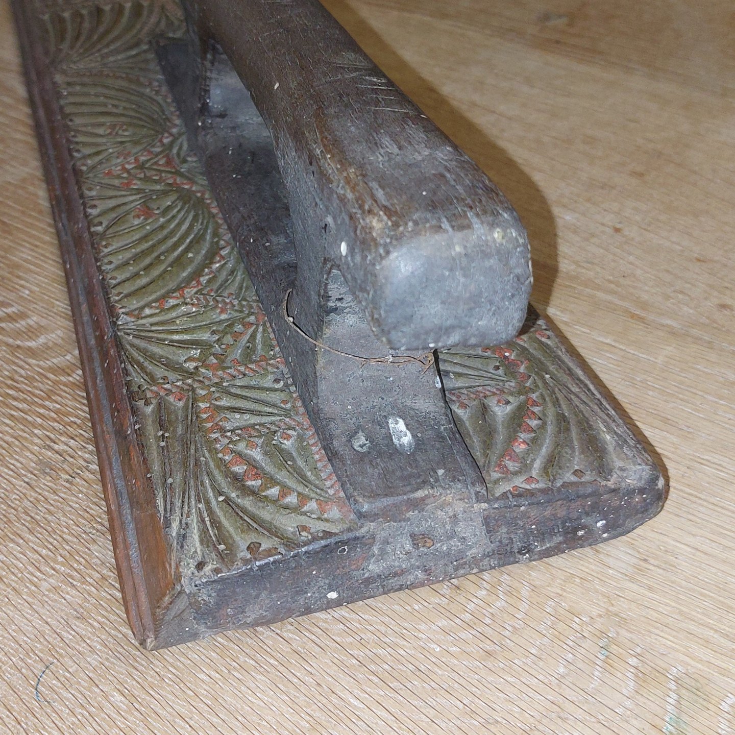 Manglebrædt skåret I træ. Rigt dekoreret incl. produktionsåret 1751. Original bemalet. Brugsspor, som det fremgår af fotos. L. 61,5 cm.