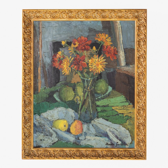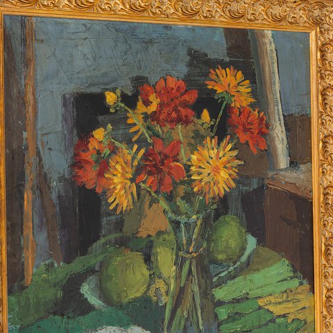 Maleri. Opstilling med blomster i udskåret ramme. Signeret.
