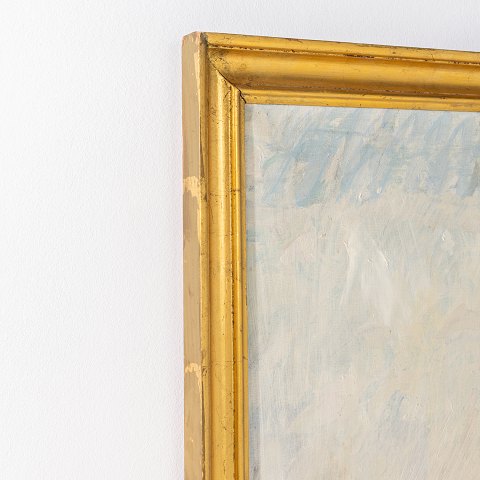 Maleri. 'Udsigt til Skansebakken ved Hillerød' med guldbemalet ramme fra 1960-61. Dauløkke. Signeret.