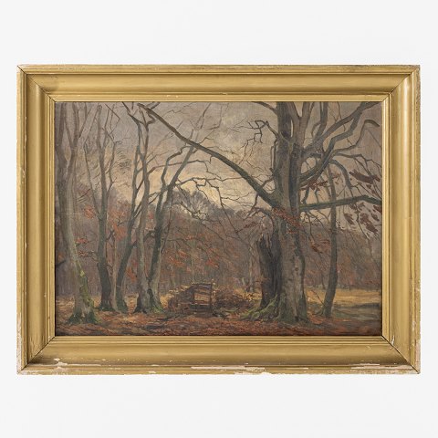Olie på lærred. Skov med guldbemalet ramme. Signeret.