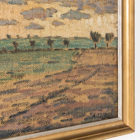 Olie på lærred. Landskab med marker i guldbemalet ramme. Signeret.