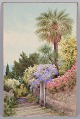 B. Righetti, italiensk kunstner. Akvarel på papir. Sydlandsk parkparti med kig til havet.