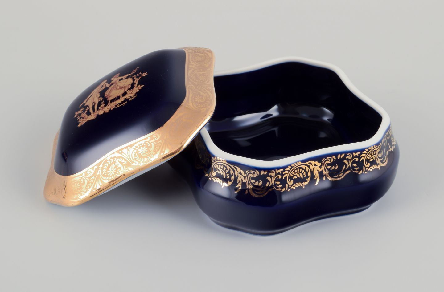 Limoges, France. Two lidded porcelain jars adorned with 22-karat gold leaf and featuring a beautiful royal blue glaze with a Scène galante.