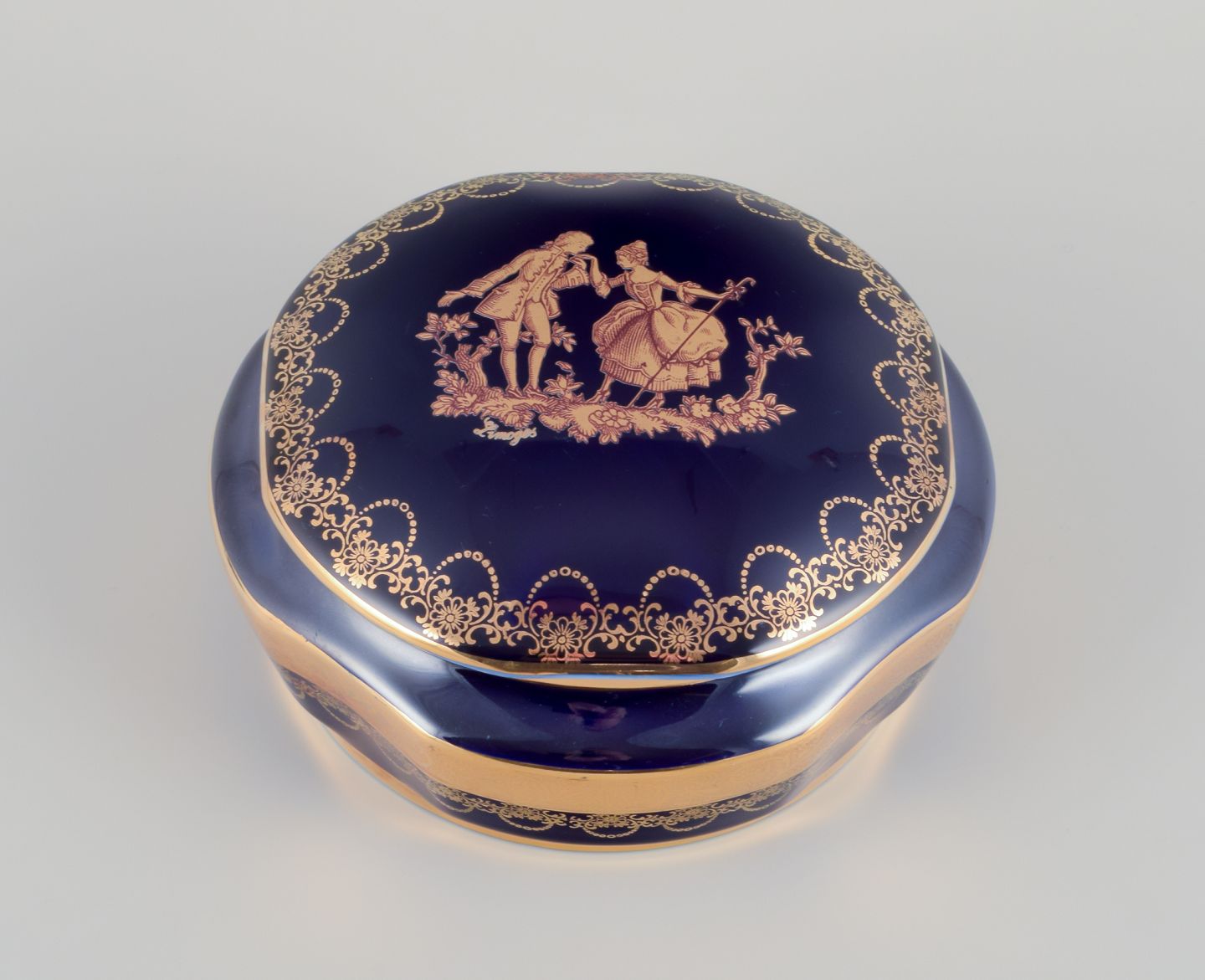 Limoges, Frankrig. To lågkrukker i porcelæn. Dekoreret i 22-karat bladguld. Smuk kongeblå glasur. Scène galante.