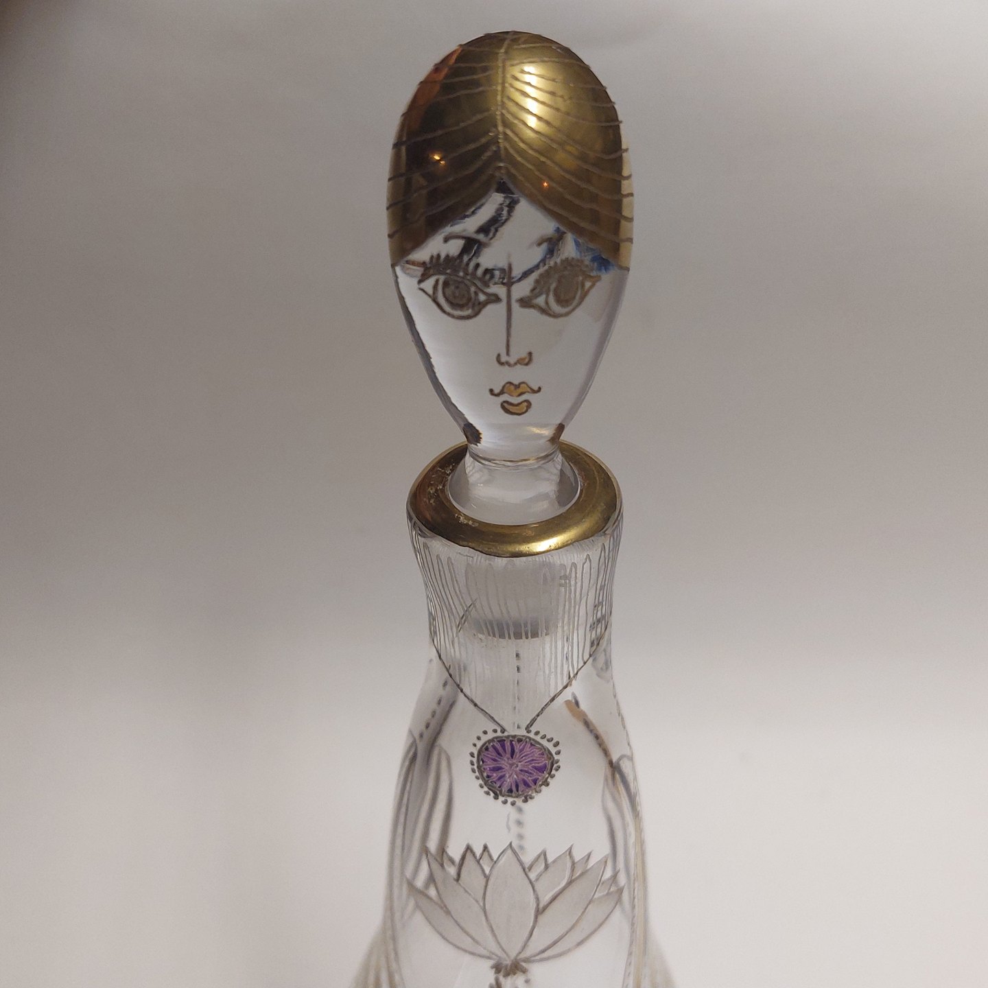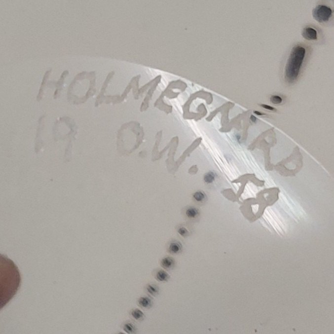 Holmegaard Glasværk: Karaffel forestillende en ung kvinde. Indridset dekorationer samt guldbemalet. På bagsiden skrevet 1959. Designet af Ole Winther i 1958. Unika arbejde muligvis til bestemt begivenhed i 1959. På bunden indridset HOLMEGAARD 19 O.W. 58. Fremstår i god stand uden skader eller reparationer. H. 29 cm