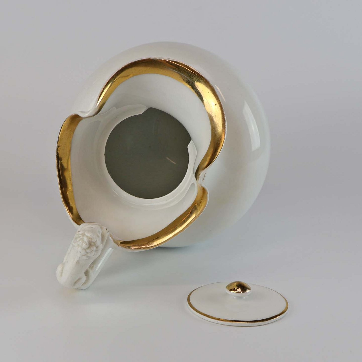 Chokoladekande af porcelæn, dekoreret med en løve på kanten. Kanden er hvid med guldkanter, låg og hank