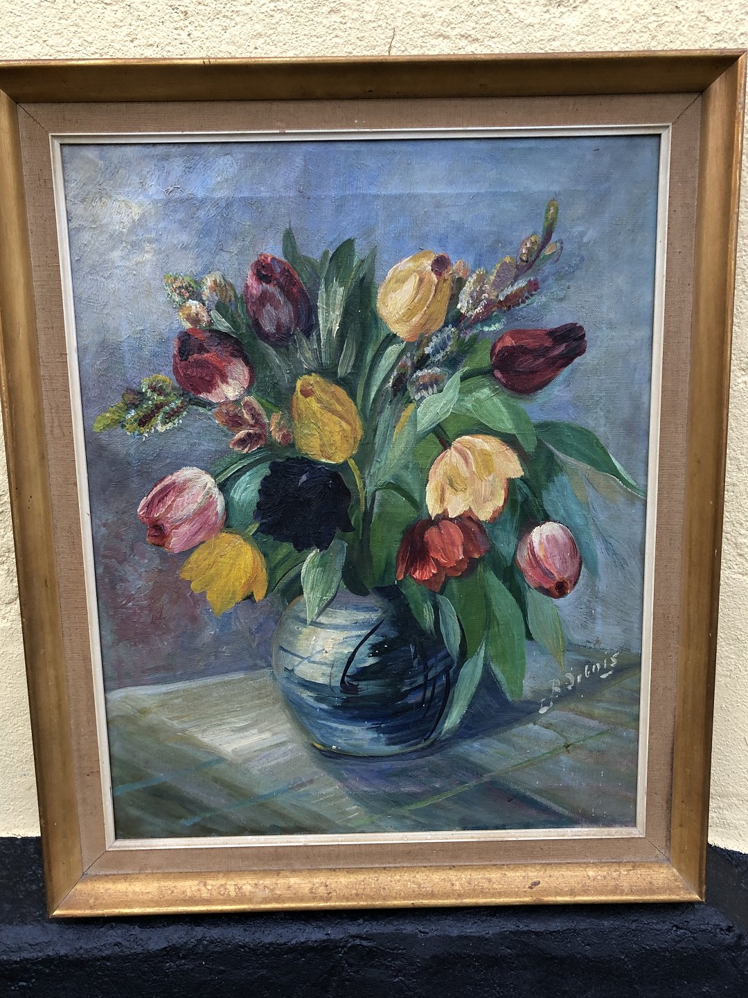 Ingeborg Debois (1897-1970). Oliemaleri på lærred, Tulipaner i vase. Mål med ramme 57x47 cm