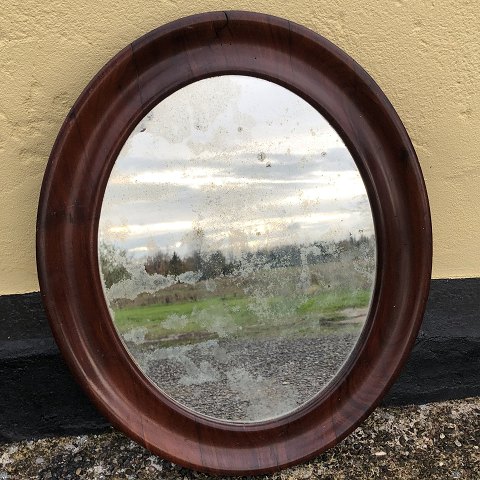 Ældre spejl i mahognifineret ramme. Kraftig patinering på spejlglasset. 59x48 cm