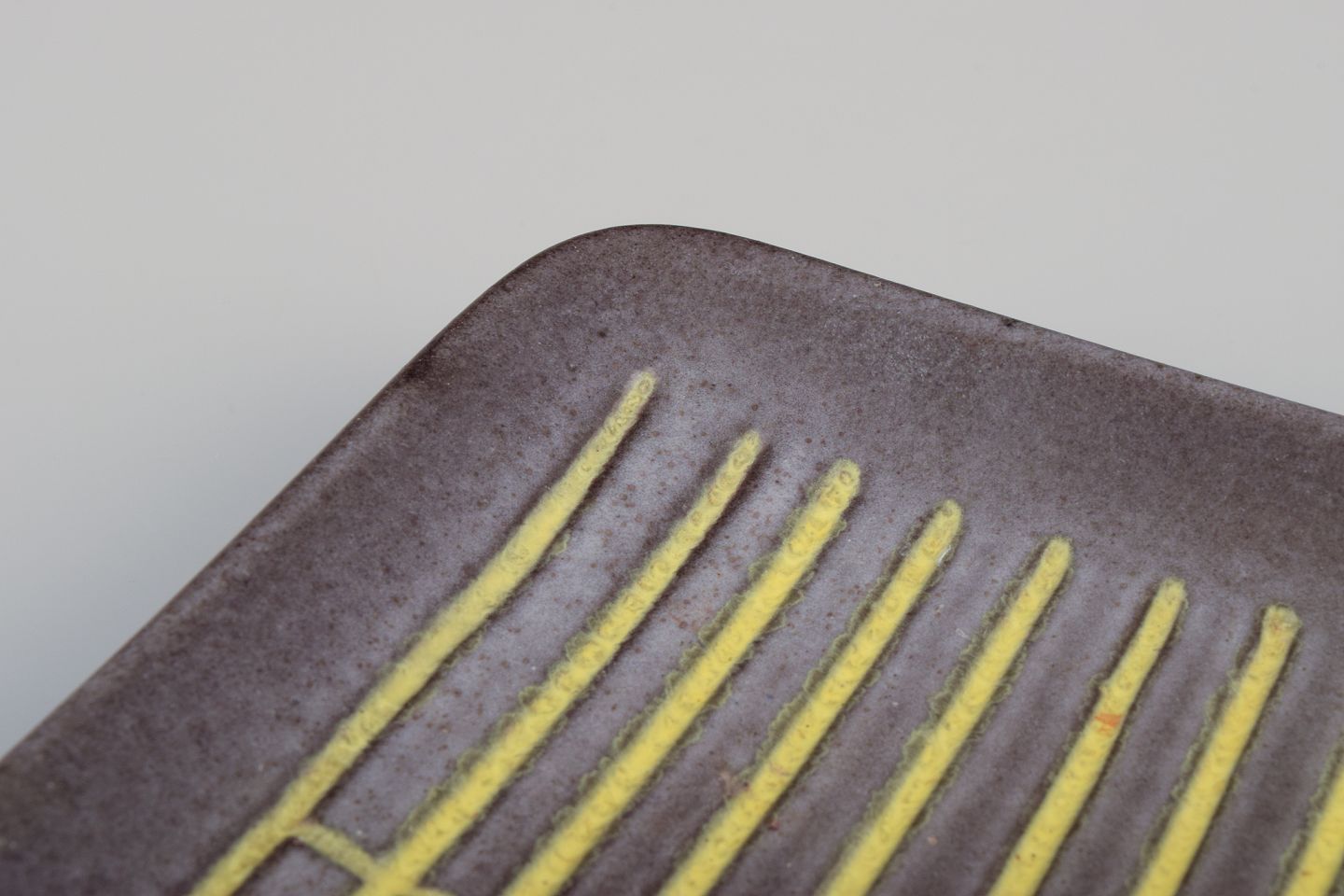 Hjördis Oldfors (1920-2014) for Upsala Ekeby. Keramikfad med glasur i gule, brune og blå toner. Geometrisk mønster.