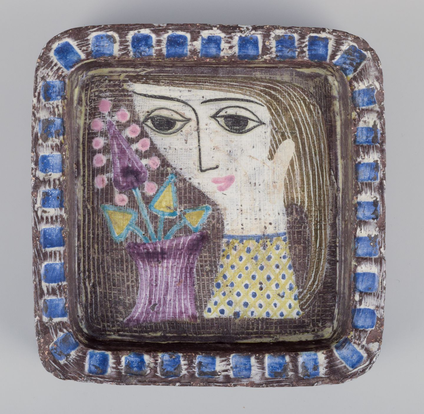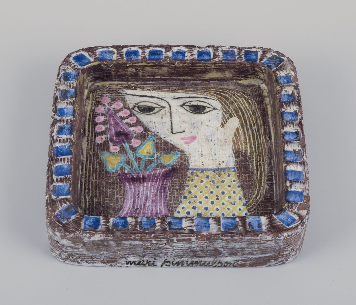 Mari Simmulson (1911-2000) for Upsala Ekeby. Keramikfad med motiv af kvinde og blomster i vase. Polykrom glasur.