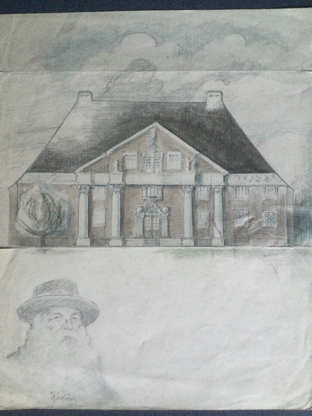Tegning - Fransk palæ samt portræt af Auguste Rodin.