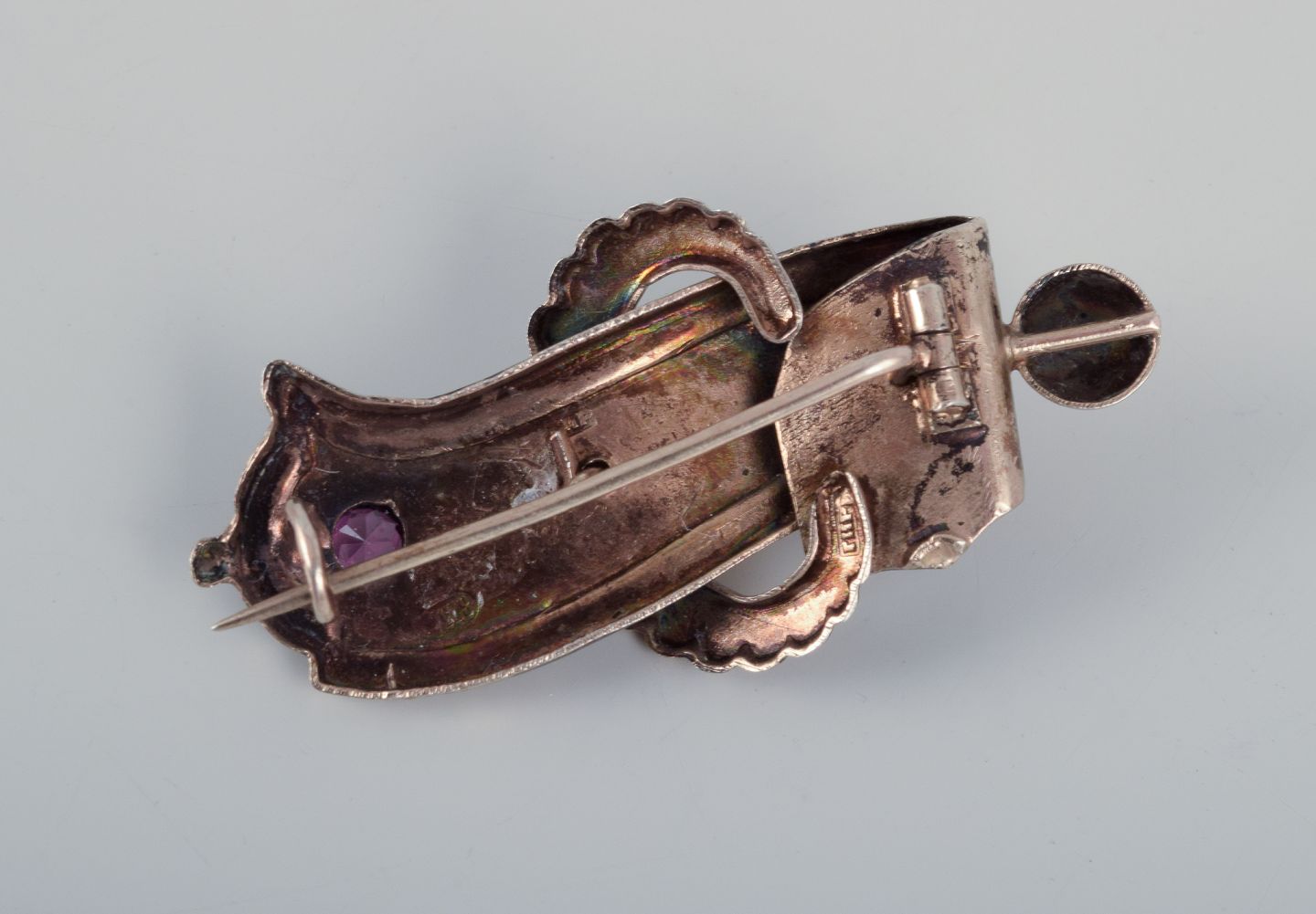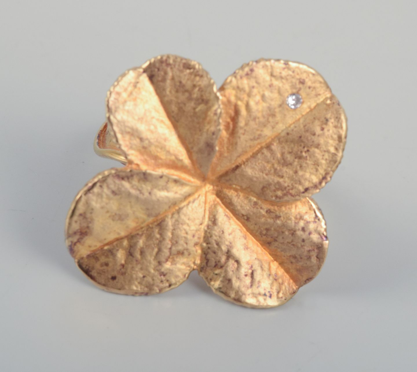 Flora Danica jewellery med mere. Tre Flora Danica fingerringe i forgyldt sterlingsølv samt en sølvbroche prydet med violet halvædelsten. Brochen er stemplet FHP.