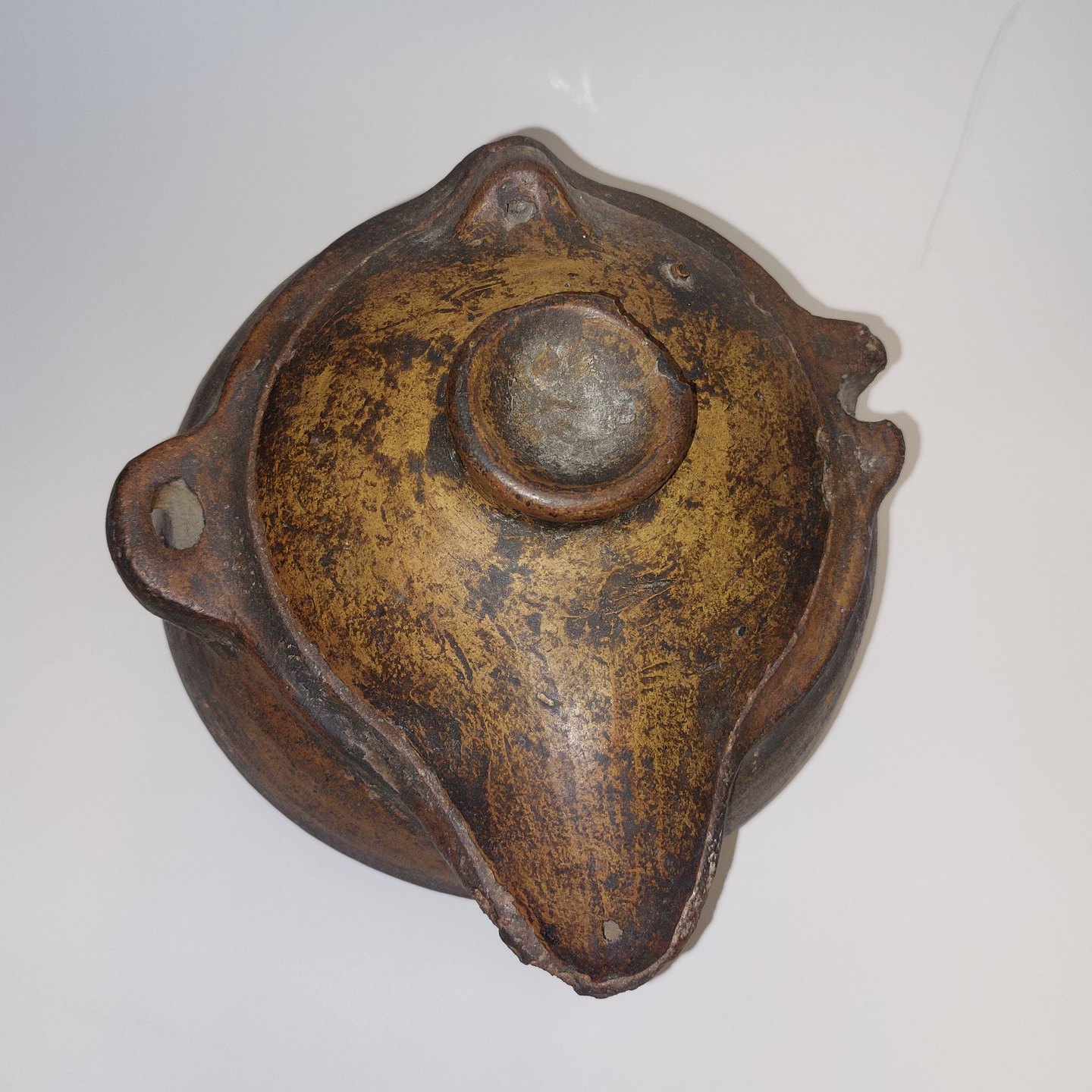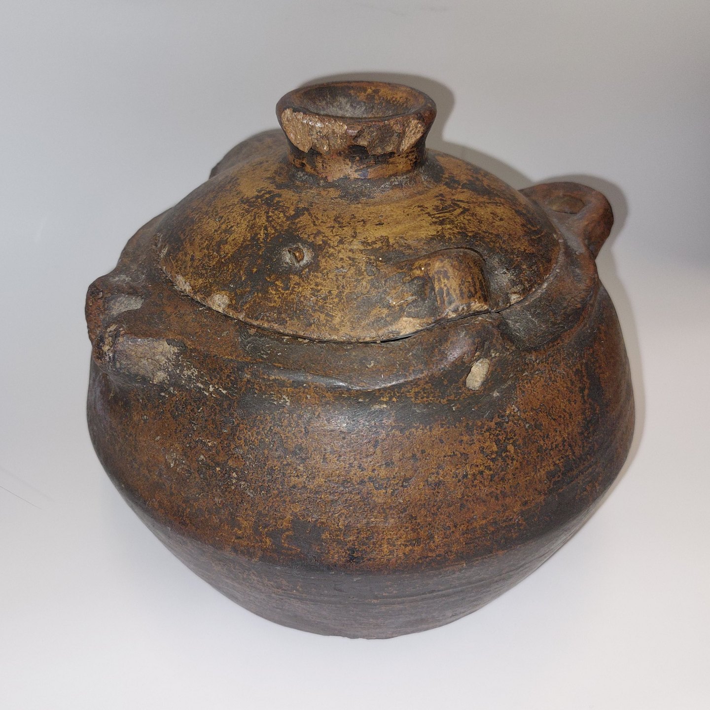 Skulpturel marokkansk gryde med låg til madlavning. Smuk.patina samt adskillige brugsspor, hvilket ses på alle fotos. Fremstillet omkring 1900 i Nordafrika. Mål: H. 17 cm L. 22,5 cm. Grydens diameter på midten ca. 19,5 cm