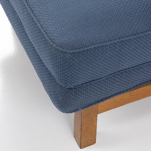 Armchair in each patinated niger leather and blue textile with brass rivets and walnut frame.