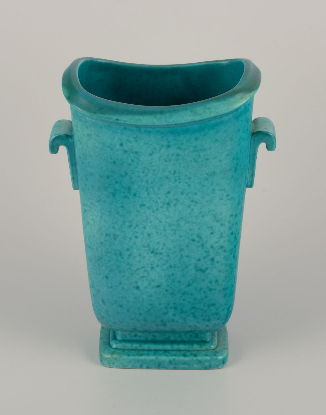 Wilhelm Kåge (1889-1960) for Gustavsberg. Stor ”Argenta” vase med to hanke. Glasur i grønne nuancer. Sjælden form.