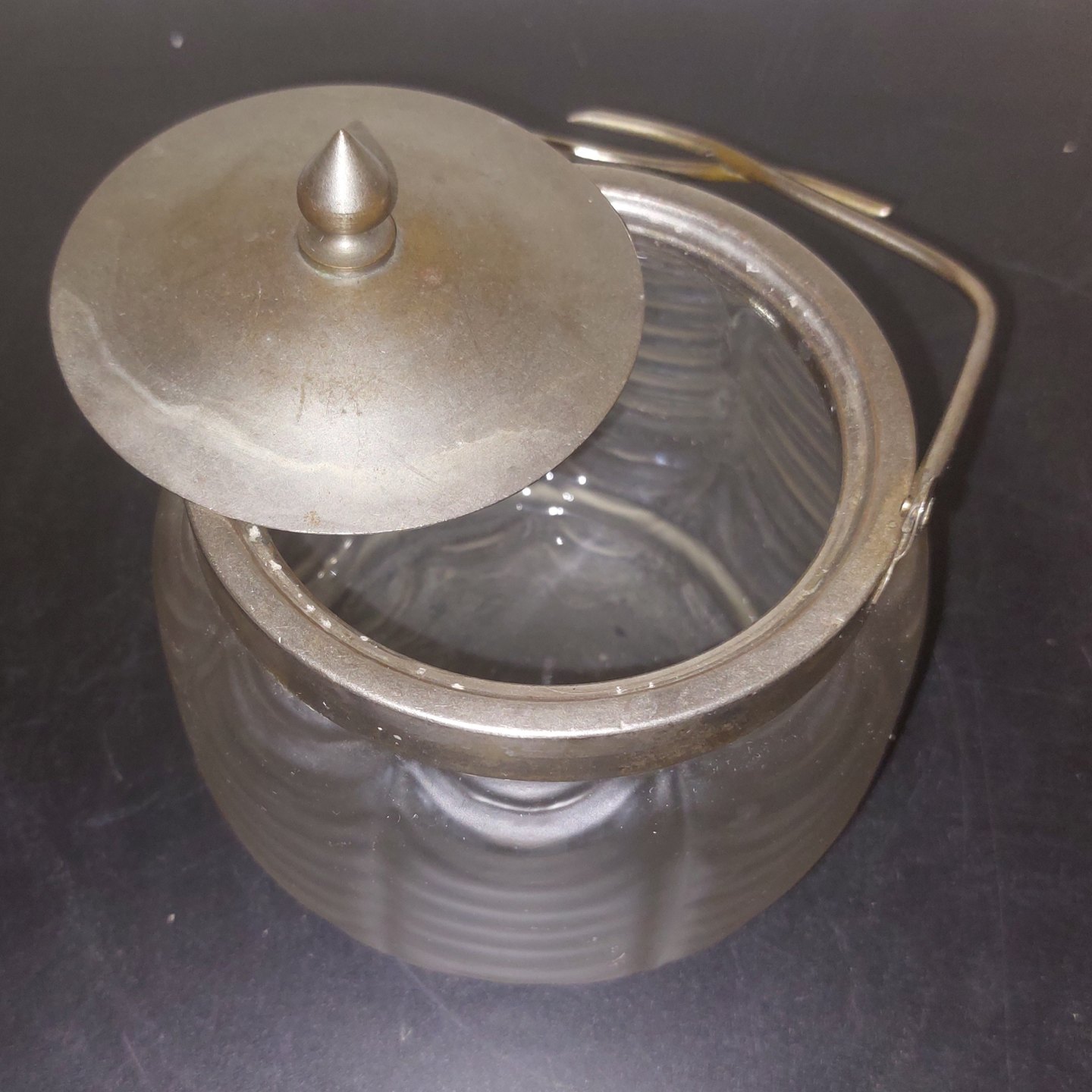 Sukkerskål I art nouveau glas med metalhank og låg. I god stand uden skader eller reparationer. Højde incl. låg 12 cm