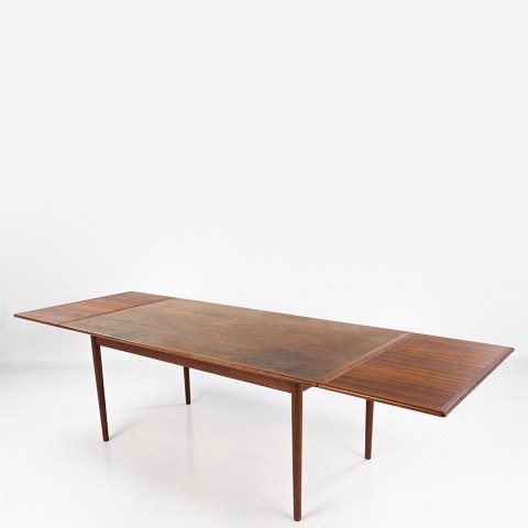 Spisebord i teak med to tillægsplader. Tillægsplader tilføjer 90 cm ekstra i alt.