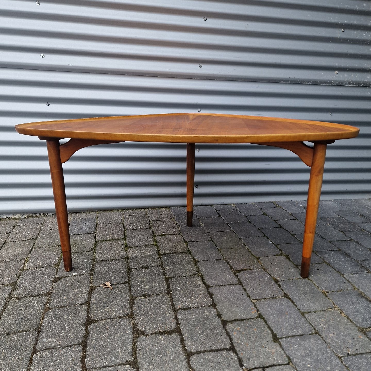Trekantet sofabord af teaktræ og egetræ. De to træsorter giver et flot mønster på bordpladen og på benene